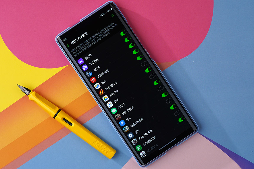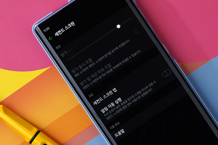 세컨드 스크린 설정에서는 메인과 세컨드 스크린을 밝기를 동시에 조절할 수 있는 옵션이 준비되어 있습니다. 그리고 세컨드 스크린에서는 선택한 앱만 앱서랍에 표시됩니다.