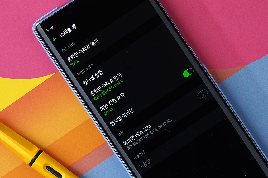 스위블 홈의 설정을 확인해 보면 메인이나 세컨드 스크린을 아래로 밀어서 알림창이나 빠른 설정을 실행할 수 있고 멀티앱 기능을 통해서 메인과 세컨드 스크린에서 실행할 앱을 하나로 묶어줄 수 있습니다. 활용도가 높은 기능이라고 판단되었습니다.