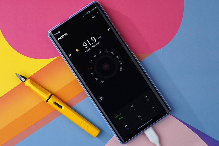 번들 유선 이어폰을 안테나로 사용하는 FM 라디오 기능도 탑재되었습니다. 자동으로 채널을 검색하고 자주 듣는 방송은 즐겨찾기에 등록할 수 있습니다. LG WING(윙)을 효도폰으로 사용하려는 분들에게 유용한 부분입니다.