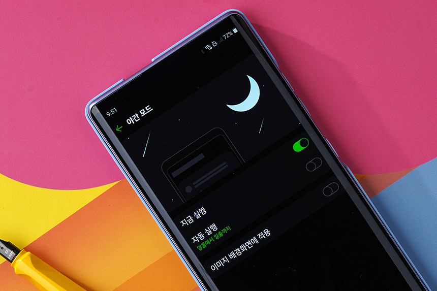 LG WING(윙)에는 리얼블랙을 표현할 수 있는 올레드 풀비전 디스플레이가 탑재되었고 어두운 테마인 야간 모드도 지원합니다. 야간 모드로 스마트폰을 사용하면 눈이 조금 편안해지는 것은 물론이고 배터리 성능의 향상을 기대할 수 있습니다.
