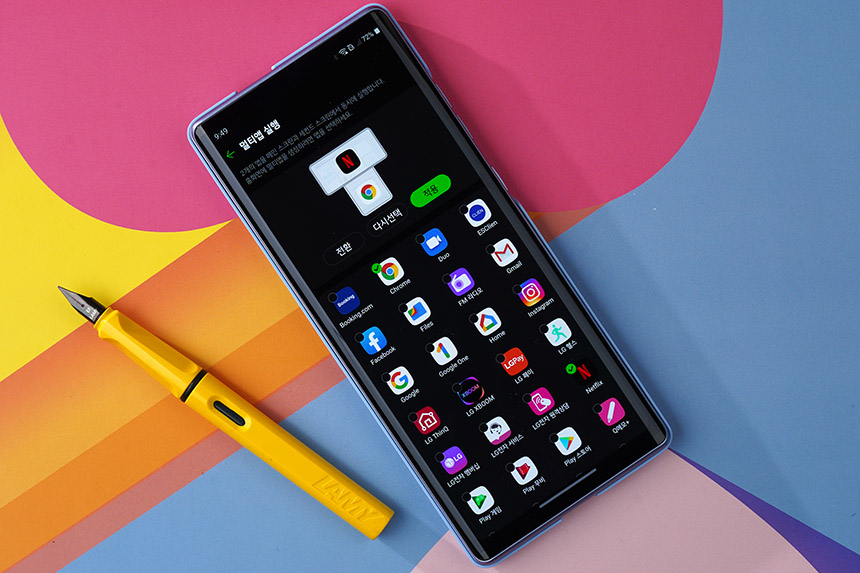 멀티 윈도우 기능을 이용하면 메인 스크린을 이용해서 두 개의 앱을 동시에 실행시킬 수 있습니다. 특히 LG WING(윙)의 노치나 펀치홀 디자인이 적용되지 않아서 눈에 거슬리는 부분이 없습니다.