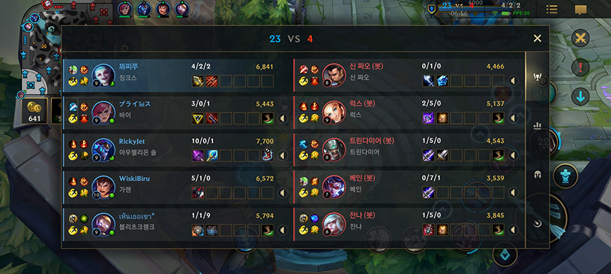 그리고 컴퓨터 버전의 롤처럼 우리 편과 상대 편의 KDA과 아이템 상태도 바로 확인할 수 있습니다. 참고로 리그 오브 레전드 와일드 리프트는 전히 처음부터 새롭게 제작되었기 때문에 일부 조작감에서 차이가 있을 수 있습니다.