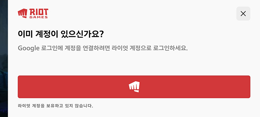 그런데 뜬금없이 라이엇 계정을 가지고 있냐고 다시 물어보게 됩니다. 구글과 라이엇 계정을 연동시켜 놓으려는 것 같은데요. 아래쪽에 있는 ‘라이엇 계정을 보유하고 있지 않습니다.“를 선택해주면 됩니다.