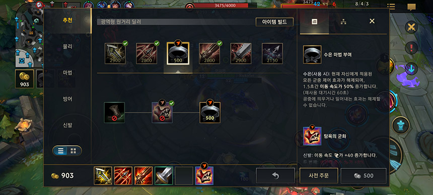 아이템도 큰 틀에서는 PC버전과 차이가 없고 추천 템을 조금 더 편리하게 구매할 수 있도록 도와주는 템이 탑재되었습니다. PC 버전을 많이 플레이해본 게이머라면 어렵지 않게 적응할 수 있을 것 같습니다.