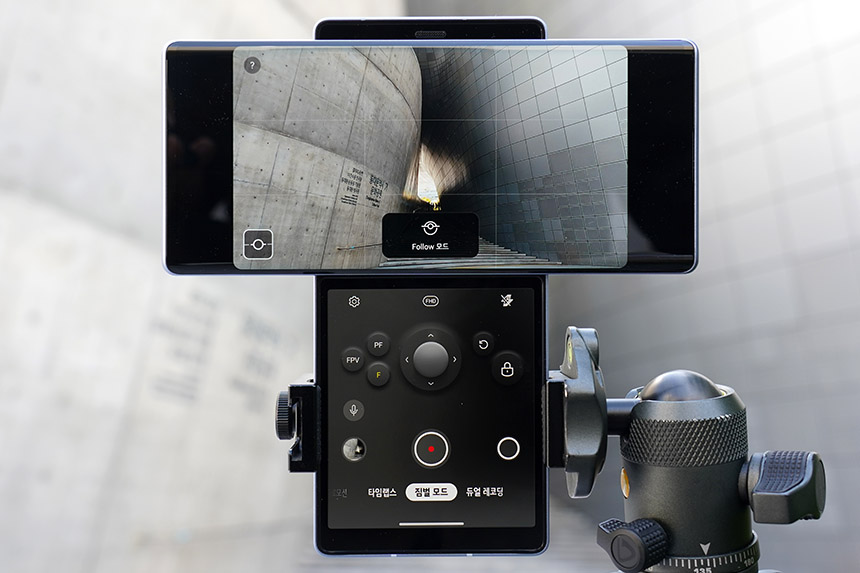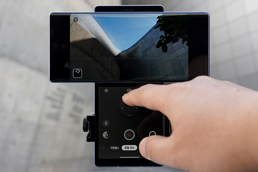 LG 윙(WING)에는 위쪽부터 1,200만 화소의 짐벌과 6,400만 화소의 광각 그리고 1,300만 화소의 초광각 트리플 카메라가 탑재되었습니다. 재미있는 부분은 짐벌 전용 카메라를 탑재했다는 점입니다. 그래서 이동 중에도 흔들림이 적은 동영상을 촬영할 수 있습니다.