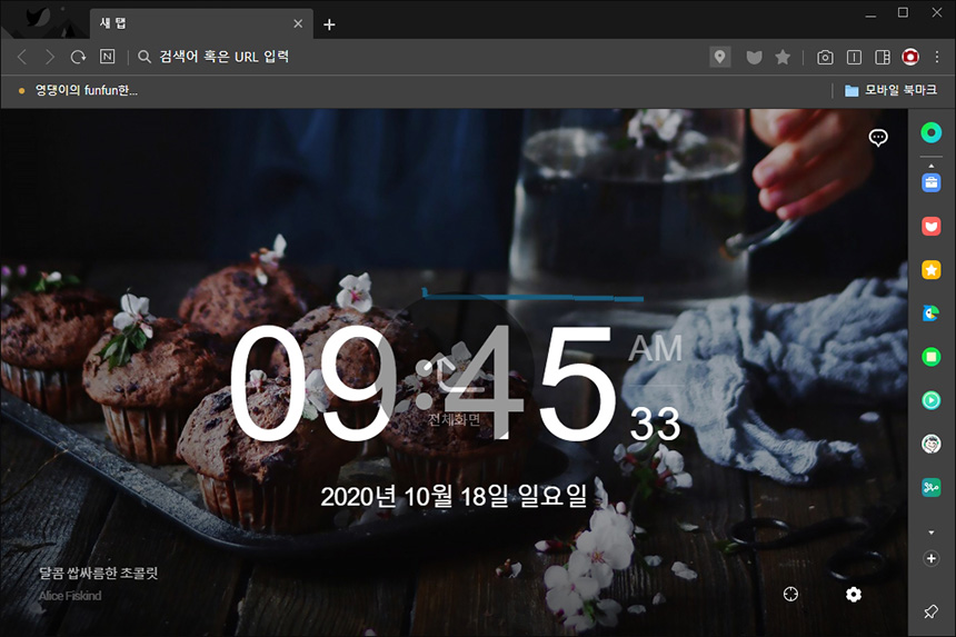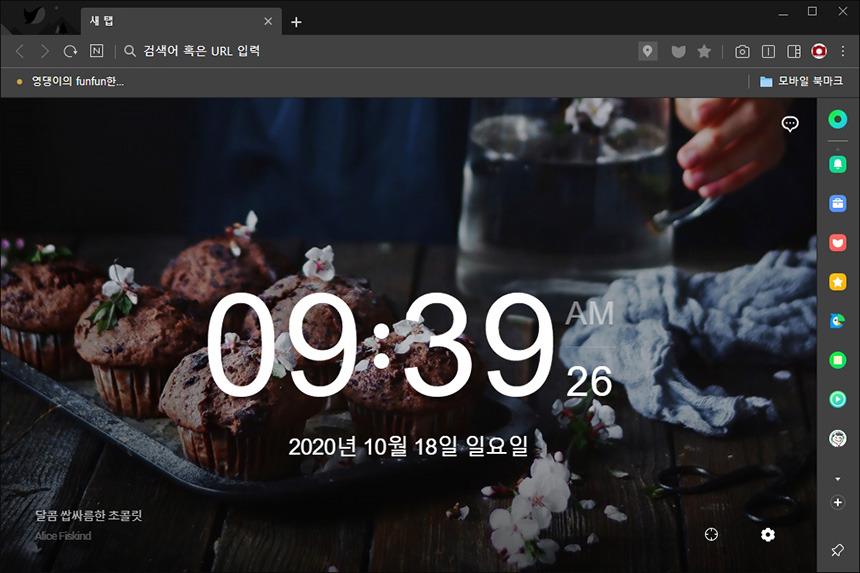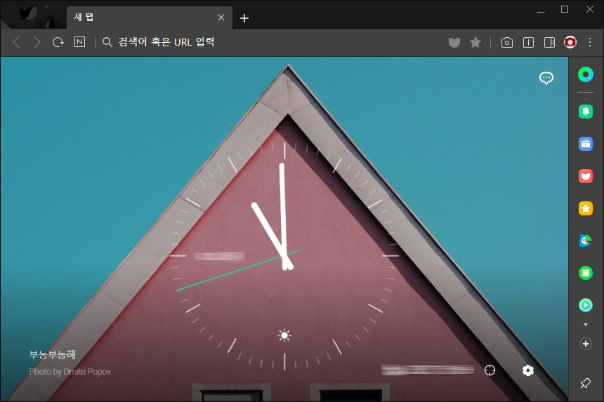 네이버 웨일의 시작 페이지를 확인해 보면 시간이나 날씨 등이 표시됩니다. 사용자에 따라서 호불호가 약간 갈릴 수 있는데요. 만약 듀얼 모니터를 사용한다면 배경화면 대신 사용할 수도 있을 것 같습니다.