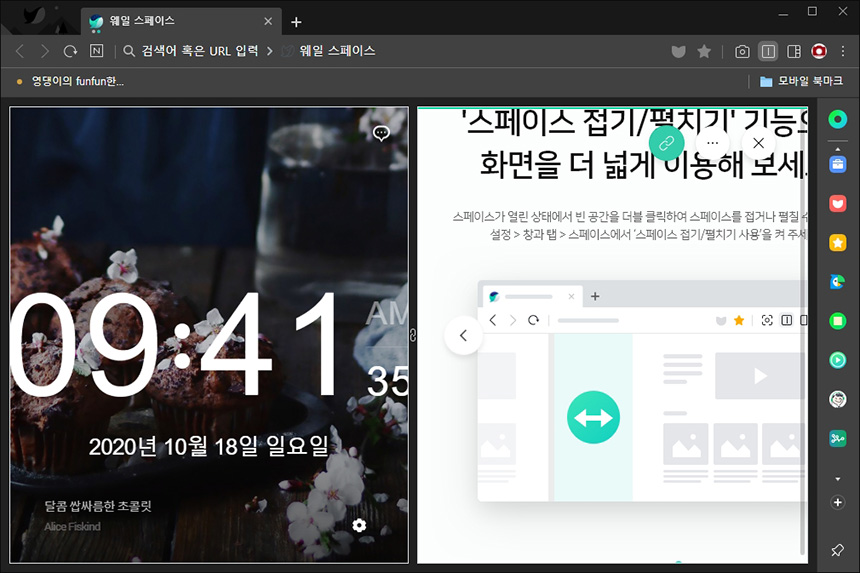 네이버 웨일의 또 다른 특징은 스페이스 기능을 통해서 화면을 두 개로 분할할 수 있다는 점입니다. 나무위키와 같은 사이트에서 스마트폰의 스펙을 비교하는 용도로 적합한 기능입니다.