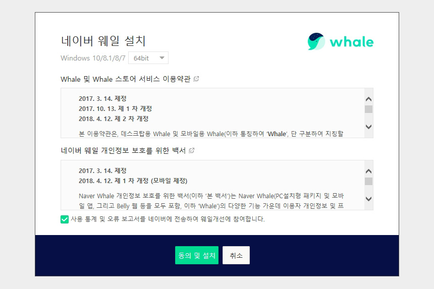 네이버 웨일을 설치하면 사용 통계 및 오류 보고서를 네이버에 공유한다는 옵션이 준비되어 있습니다. 자신의 판단에 따라서 관련 내용을 체크하는 것이 좋을 것 같습니다.