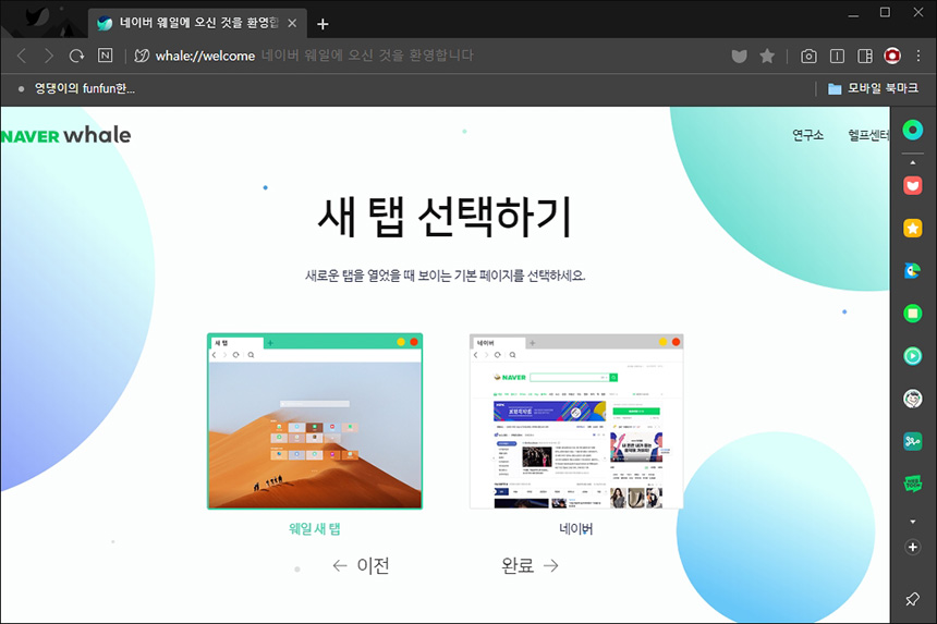 다음에는 새로운 탭을 열었을 때 웨일 새탭을 실행시킬 것인지 아니면 네이버 시작 페이지를 표시할 것인지를 결정할 수 있습니다. 네이버에서 제작한 브라우저라서 관련 서비스 이용에 최적화되어 있습니다.