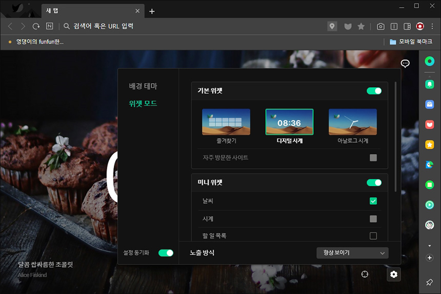 그리고 배경 테마나 위젯 모드도 변경할 수 있습니다. 디자인적인 부분에서 커스텀할 수 있는 여지가 크다는 점이 유용한 부분입니다. 사소하지만 세심하게 관련 기능들을 배치한 것 같습니다.