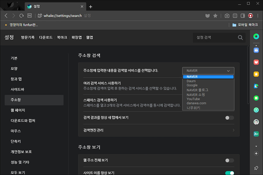 마지막으로 재미있다고 생각했던 기능은 주소창 검색 기능에 네이버 이외에도 유튜브나 다나와 그리고 나무위키를 등록해서 사용할 수 있다는 점입니다. 특히 나무위키에서 스펙 등의 정보를 자주 확인하는 저에게 유용하다고 생각되었습니다.
