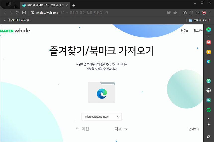 네이버 웨일의 초기 설정 과정을 살펴보면 기존에 사용하고 있는 마이크로소프트 엣지나 다른 브라우저에서 즐겨찾기나 북마크를 가져올 수 있는 옵션이 준비되어 있습니다. 예전부터 지원하던 기본 기능입니다.