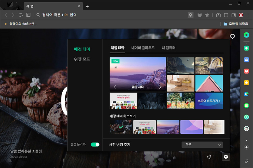 네이버 웨일를 설치하면 기본적으로 다크모드가 적용되어 있습니다. 저와 같이 LG 올레드 TV를 모니터로 사용하는 분들에게는 유용한 옵션이라고 할 수 있고 눈이 조금 더 편안하다는 장점이 있습니다.