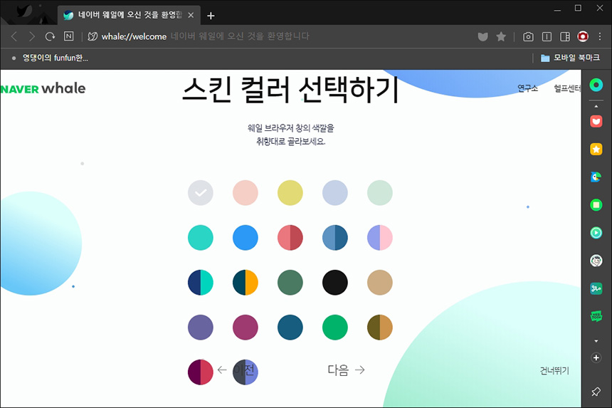 다음에는 스킨 컬러를 지정할 수 있습니다. 다른 브라우저와 차별화된 장점이라고 할 수 있습니다. 이왕이면 디자인이 깔끔한 프로그램이 손이 더 가는 것이 사실인 것 같습니다.