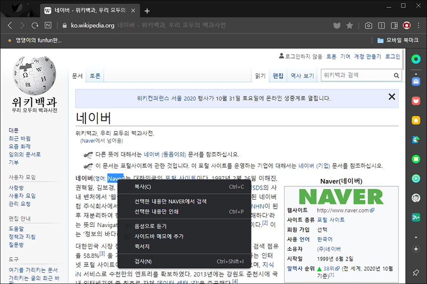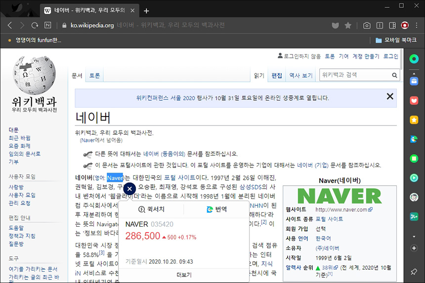 네이버 웨일에서 웹 페이지를 검색하다가 단어를 선택하면 퀵서치 기능을 실행할 수 있습니다. 다른 브라우저도 지원하는 기능이지만 주가까지 보여준다는 점이 독특한 부분입니다.