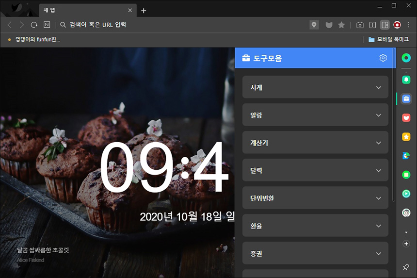도구 모음에서는 세계 시계나 알람 그리고 계산기, 환율, 증권 정보를 확인할 수 있습니다. 네이버 웨일이 다른 브라우저들과 차별화된 장점이라고 할 수 있습니다. 기대했던 것 이상으로 편리한 편입니다.
