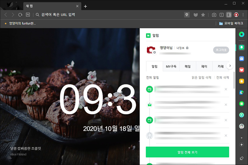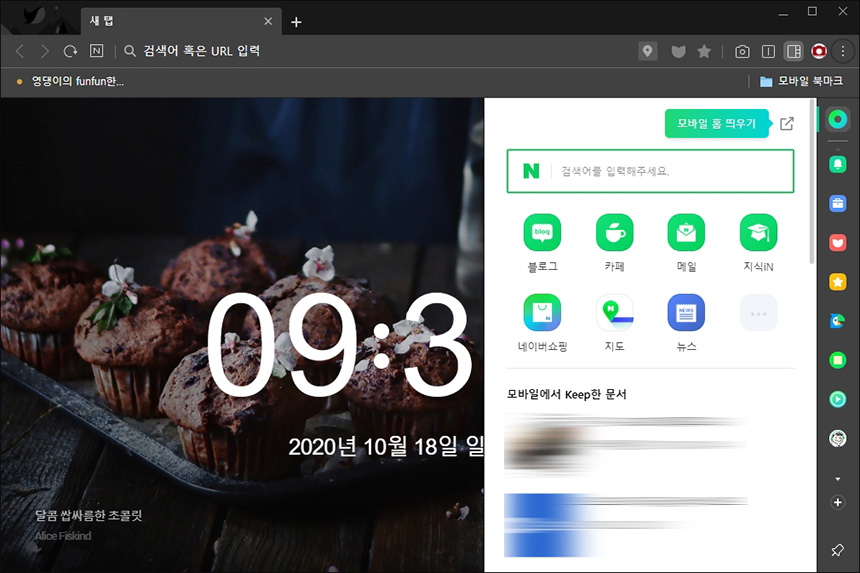 네이버 웨일의 사이드 패널은 상당히 편리한 기능 중의 하나입니다. 우선 그린닷을 선택하면 네이버에서 제공하는 블로그나 카페 그리고 메일과 같은 서비스에 빠르게 접근할 수 있습니다.