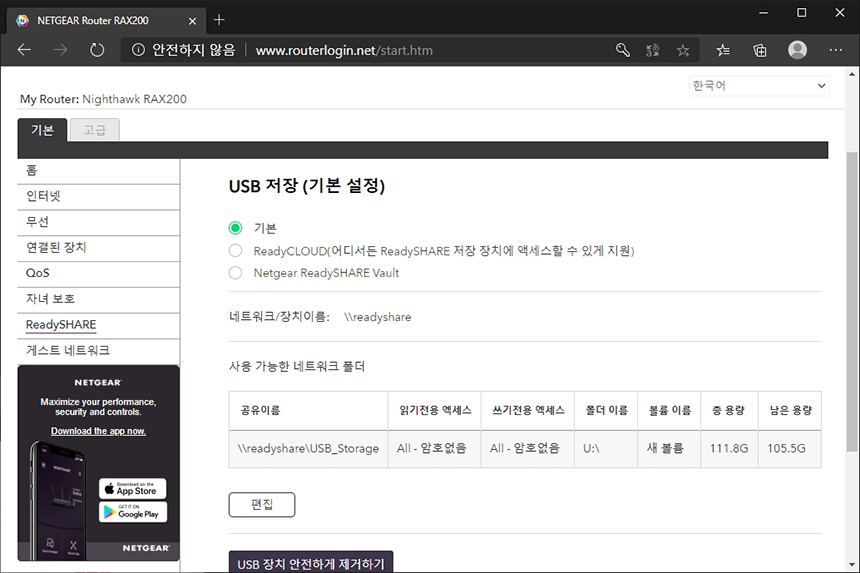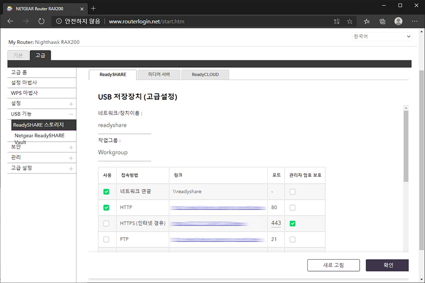 넷기어 RAX200 와이파이 공유기에는 2개의 USB 3.0포트가 탑재되었고 외장하드를 연결해서 NAS로 활용할 수 있습니다. 그리고 관련 기능은 ReadySHARE를 통해서 설정할 수 있습니다.