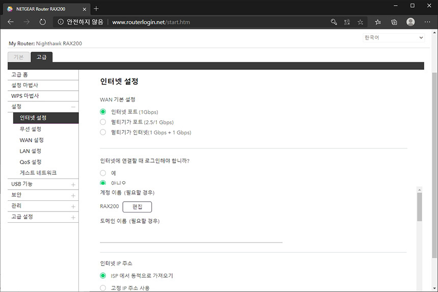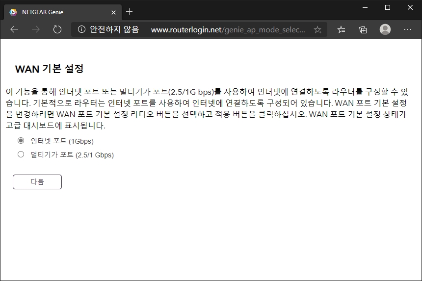 그리고 웹 브라우저를 이용해서 www.routerlogin.net 이라는 주소에 접속하면 초기 설정을 진행할 수 있습니다. 우선 WAN 기본 설정에서는 멀티기가 포트를 이용해서 인터넷을 구성할 수 있는 기능도 준비되어 있습니다. 일반적인 가정 환경이라면 인터넷 포트(1Gbps)를 선택해주면 됩니다.