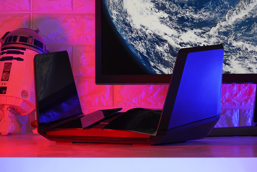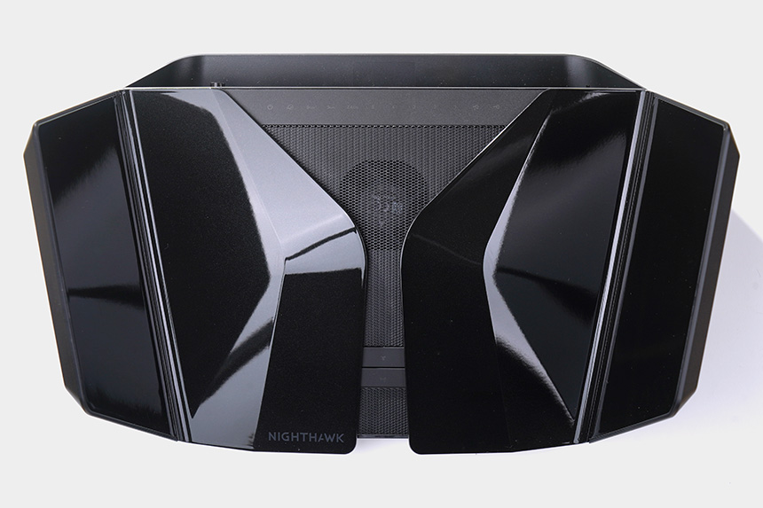 넷기어 RAX200 와이파이 공유기를 앞쪽에서 살펴보면 스타워즈 영화에서나 볼 것 같은 우주선처럼 제작되었습니다. 디자인적인 부분에서는 완성도가 상당히 높은 편이라고 생각되었습니다.