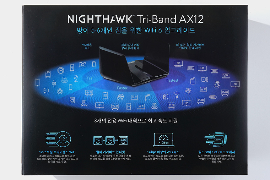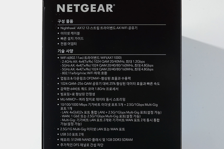 박스의 뒷면을 살펴보면 넷기어 RAX200 와이파이 공유기의 주요 특징이 설명되어 있습니다. 우선 12 스트림 트라이밴드 와이파이와 멀티 기가비트 인터넷을 지원해서 최고 수준의 유무선 속도를 제공합니다.