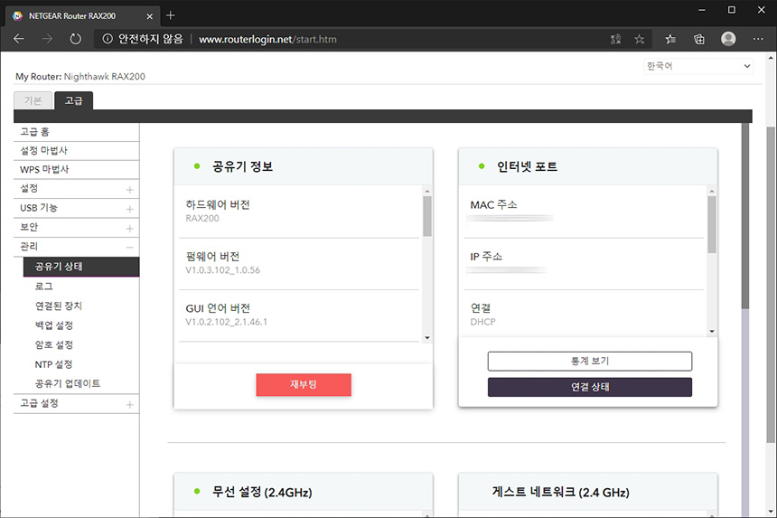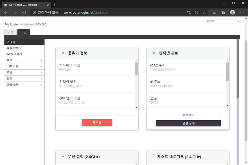 고급 탭의 고급 홈에서는 넷기어 RAX200 와이파이 공유기의 정보와 인터넷과 무선 설정을 더욱 디테일하게 확인할 수 있습니다. 파워 유저를 위한 메뉴들이라고 할 수 있습니다. 그래서 관련 지식이 없는 분들은 설정을 변경하지 않는 것이 좋을 것 같습니다.