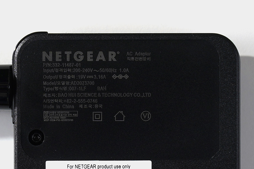 어댑터의 스펙을 확인해 보면 정격입력은 200~240V 50/60Hz이고 정격출력은 19V 3.16A 약 60W로 일반적인 공유기와 비교하면 출력이 큰 편이라고 할 수 있습니다. 그래서 안정적으로 넷기어 RAX200 와이파이 공유기를 사용할 수 있습니다.