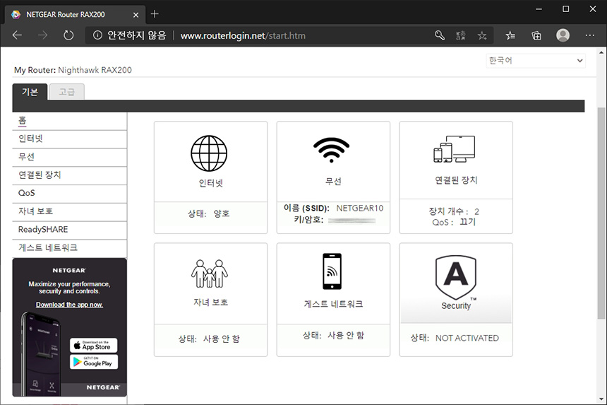 넷기어 RAX200 와이파이 공유기의 관리자 페이지에서는 다양한 기능을 제공합니다. 우선 기본 탭의 홈 화면에서는 인터넷과 무선 그리고 연결된 장치까지 상태를 한눈에 확인할 수 있습니다.