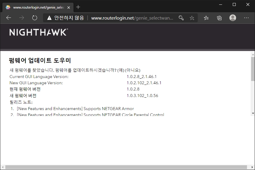 설정이 완료되면 펌웨어 업데이트 도우미가 실행되고 현재와 새 펌웨어 버전을 확인할 수 있습니다. 일반적으로 보안성은 물론이고 편의성도 개선되기 때문에 최신 버전으로 유지하는 것을 추천합니다.
