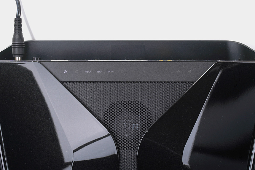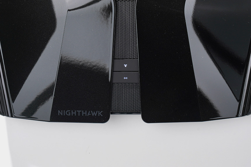 상단의 위쪽을 살펴보면 상태를 표시해주는 LED 패널이 배치되어 있어서 넷기어 RAX200 와이파이 공유기의 상태를 한눈에 확인할 수 있습니다. 그리고 필요에 따라서 전원을 제외한 다른 조명은 끌 수 있습니다.