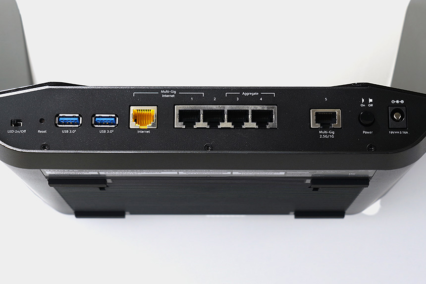 뒤쪽을 살펴보면 LED ON/OFF 스위치와 2개의 USB 3.0 단자가 탑재되었습니다. 그리고 넷기어 RAX200 와이파이 공유기의 장점 중의 하나는 WAN이나 LAN포트로 활용할 수 있는 2.5G 멀티기가(Multi-Gig) 포트를 내장하고 있다는 점입니다.