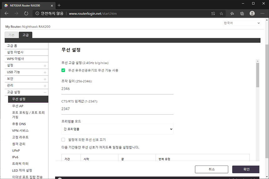 설정은 인터넷과 무선 그리고 WAN 등으로 구성되어 있습니다. Qos나 게스트 네트워크도 지원하기 때문에 자신의 필요에 따라서 넷기어 RAX200 와이파이 공유기를 커스터마이즈할 수 있습니다.