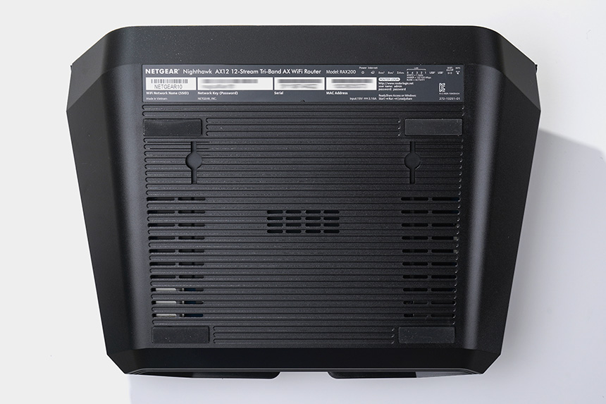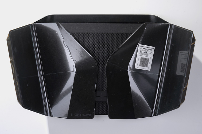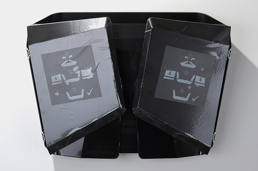 박스를 개봉하고 넷기어 RAX200 와이파이 공유기를 살펴보면 안테나와 상판에는 보호 필름이 부착되어 있는 것을 확인할 수 있습니다. 배송 중에 흠집이 생기는 것을 방지해주는 역할을 합니다.