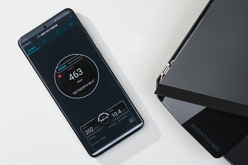 최근에 출시되는 플래그십 스마트폰들은 와이파이6를 지원합니다. 그리고 갤럭시 S20+ 기준으로 살펴보면 넷기어 RAX200 와이파이 공유기에 연결했을 때 WiFi 아이콘 옆에 6이라는 문구가 표시되고 속도도 상당히 빠른 편입니다.