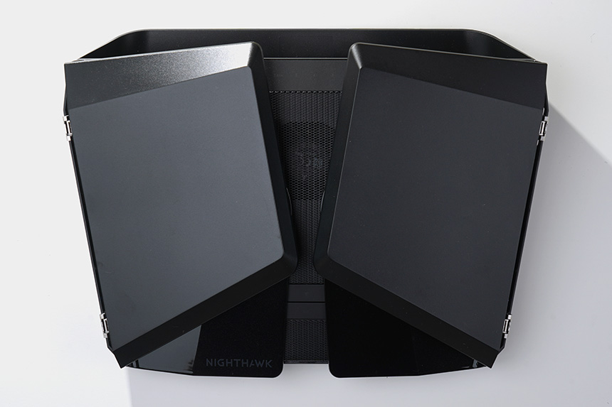 넷기어 RAX200 와이파이 공유기의 안테나는 접을 수 있도록 설계되었습니다. 그래서 보관할 때 부피를 줄일 수 있습니다. 그리고 상판은 약간 펄이 들어가 있는 형태의 유광의 블랙 컬러로 마무리되었습니다.