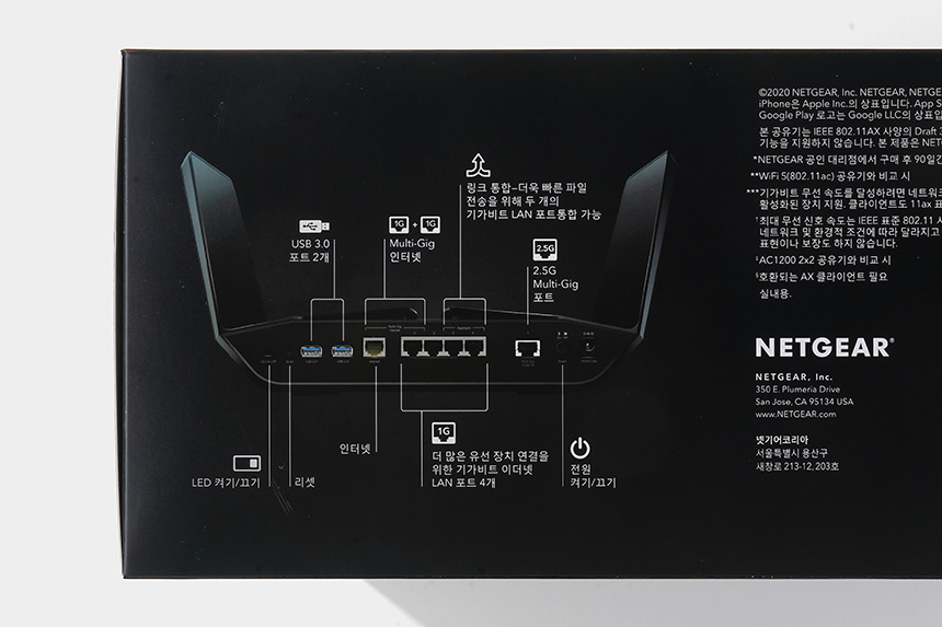 박스의 아래쪽에는 넷기어 RAX200 와이파이 공유기의 구조도 설명되어 있습니다. 일반적인 유무선 공유기와 차별화된 장점은 WAN 또는 LAN 포트로 사용할 수 있는 2.5G 멀티기가(Multi-Gig) 단자가 추가되었다는 점입니다.