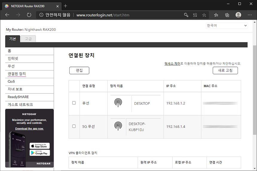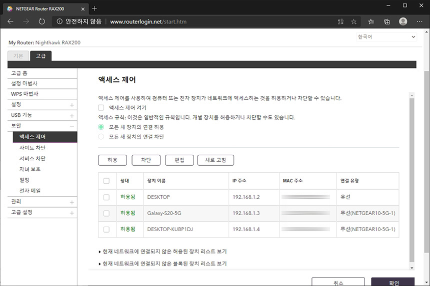 연결된 장치를 확인해 보면 현재 넷기어 RAX200 와이파이 공유기에 연결된 유무선 장치를 확인할 수 있고 엑세스 제어를 통해서 장치를 허용하거나 차단할 수 있습니다.