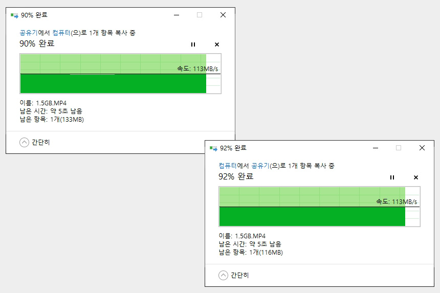 실제로 데이터를 주고받아 보면 읽고 쓰기 속도가 113MB/s로 측정되었습니다. 데이터 전송 속도는 최고 수준의 NAS와 비교해도 부족하지 않습니다. 그래서 다양한 장치들에서 간편하게 데이터를 공유할 수 있습니다.