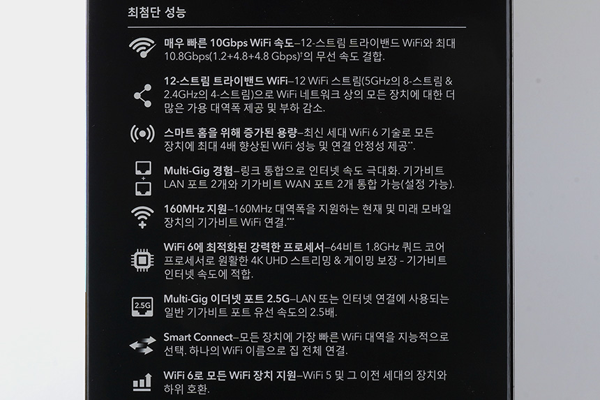 그 외에도 유선 속도를 향상 시킬 수 있는 멀티기가(Multi-Gig)와 링크 어그리게이션(LACP)을 지원합니다. 그리고 하나의 WiFi 이름으로 무선 인터넷을 사용할 수 있는 스마트 커넥트(Smart Cennect) 기능도 탑재되었습니다.