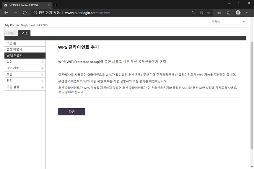 WPS 기능을 이용하면 복합기와 같이 공유기의 무선 네트워크 암호를 입력하기 어려운 장치들도 편리하게 넷기어 RAX200 와이파이 공유기에 연결할 수 있습니다. 연결 방법은 간단한데 두 기기의 WPS 버튼을 동시에 눌러주면 됩니다.