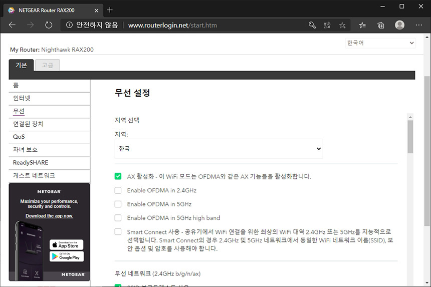 무선 설정에서는 AX 활성화나 스마트 커넥트와 같은 기능들을 켜고 끌 수 있습니다. 2.4GHz와 5GHz 대역을 하나로 묶어서 관리하고 싶으신 분들은 Smart Connect 기능을 활성화하시길 바랍니다.