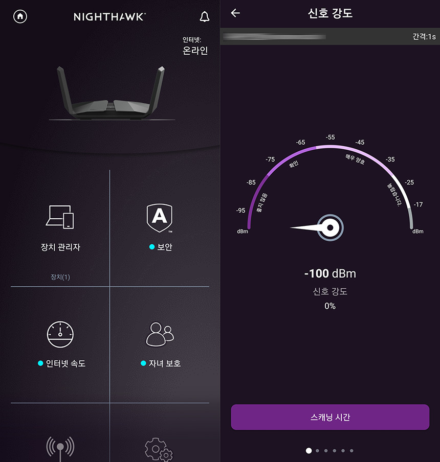 NIGHTHWAK 앱에서는 장치 관리자나 인터넷 속도 등의 메뉴가 준비되어 있습니다. 그리고 저는 위치에 따라서 신호의 강도를 측정할 수 있는 기능이 상당히 유용하다고 생각되었습니다.