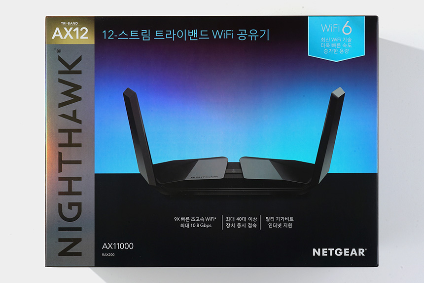 넷기어 RAX200 와이파이 공유기의 박스를 살펴보면 세련된 형태로 제작되었고 통합 속도 AX11000(11,000Mbps)를 지원한다는 문구가 표시되어 있습니다. 최고 수준의 제품이라고 할 수 있습니다.