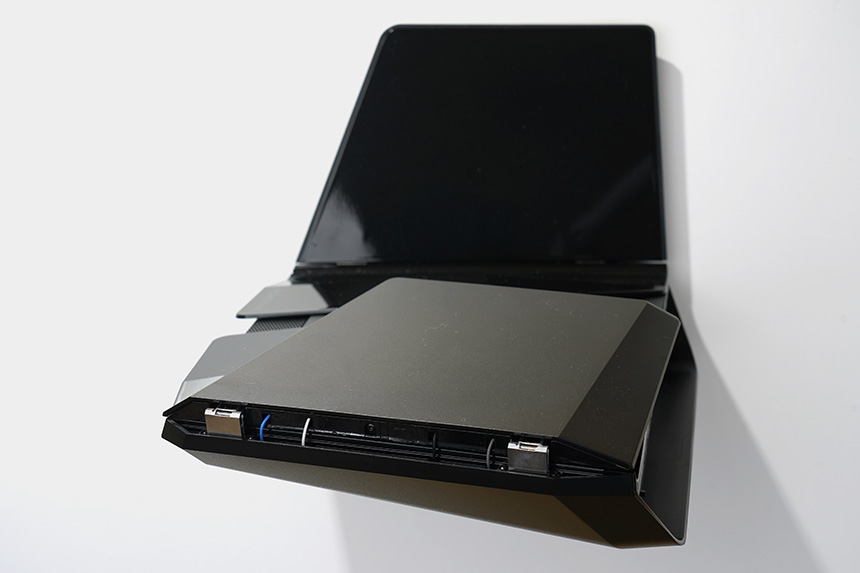 바닥을 살펴보면 시리얼 넘버와 WiFi 암호 등이 인쇄된 스티커가 부착되어 있습니다. 그리고 책상 위에 올려놓거나 벽에 걸 수 있도록 고무 지지대와 고리가 준비된 것을 확인할 수 있습니다.