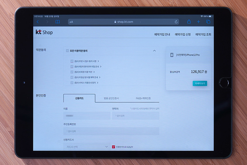 만약 신용카드나 공인인증서가 없는 분들은 PASS + 계좌인증을 통해서 아이폰 12 사전예약을 진행할 수 있습니다. 자신이 가장 편리하다고 생각하는 수단을 이용해주면 됩니다.