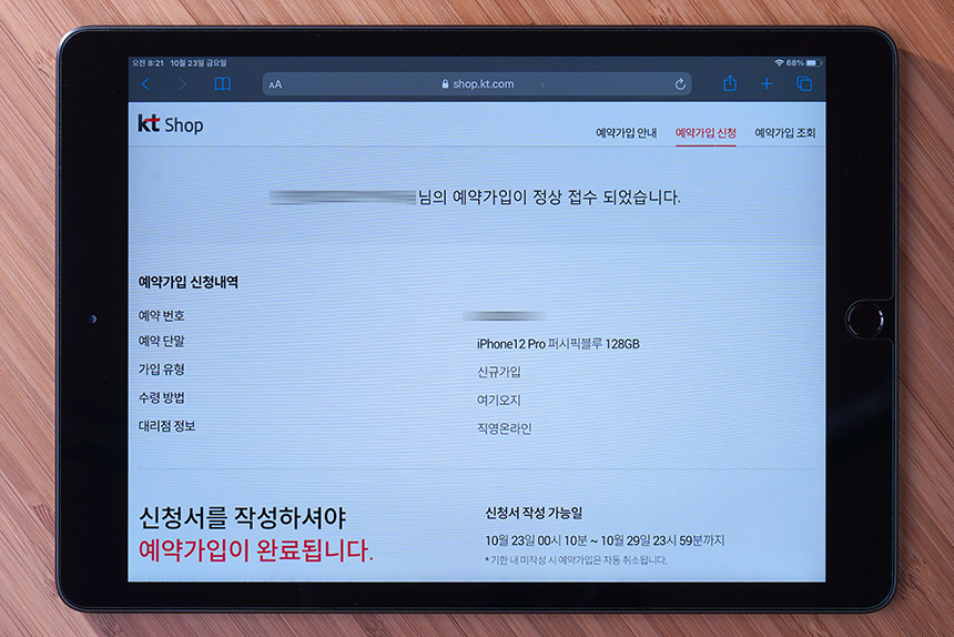 수령 방법까지 선택하면 마지막으로 신청서를 작성해야 합니다. 신청서의 장석은 10월 29일까지이고 기간 내에 작성하지 않는다면 주문은 자동으로 취소됩니다. 그래서 사전예약을 할 때 바로 완료하는 것을 추천합니다.