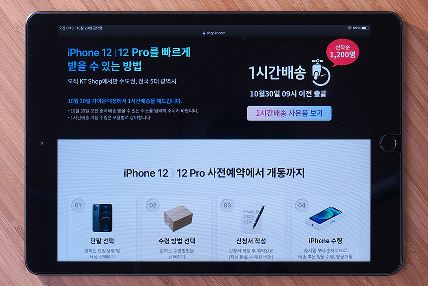 우선 KT SHOP을 방문하면 사전예약을 진행하는 방법이 자세하게 안내되어 있습니다. 우선 단말과 수령 방법을 선택하고 신청서를 작성하면 끝납니다. 참고로 1시간배송의 경우에는 빠르게 마감되었습니다.