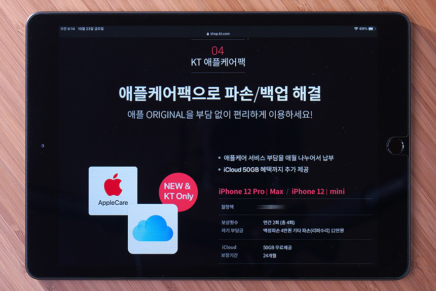 KT에서는 애플과의 제휴를 통해서 애플케어팩을 출시했습니다. 매월 일정 금액을 부담하면 연간 2회(총 6회)에 한해서 자기부담금이 액정 파손의 경우에는 4만원, 리퍼 수리는 12만원이 부가됩니다. 아이폰 12의 디자인을 온전히 느끼기 위해서 생폰으로 사용할 분들은 조건을 한 번 따져 보시길 바랍니다.