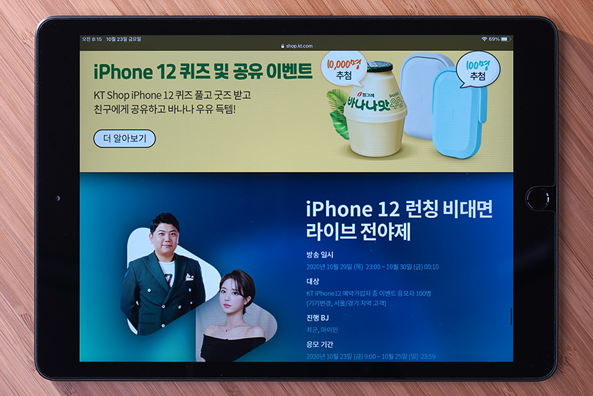 마지막으로 아이폰 12는 런칭 비대면 라이브 전야제가 10월 29일에 진행된다고 합니다. 참여 신청을 한 100명을 선정해서 맥북 에어와 같은 다양한 선물이 제공된다고 합니다.
