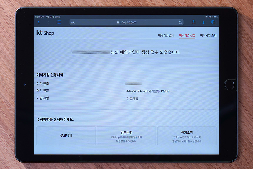 “예약가입 하기” 버튼을 누르면 정상적으로 접수가 되었다는 문구와 함께 관련 정보가 문자로 전송됩니다. 그리고 수령방법을 선택해야 하는데요. 무료택배나 방문수령 그리고 여기오지 중에서 선택할 수 있습니다. 여기오지를 선택하면 아이폰12를 원하는 시간과 장소로 배송을 해주는데요. 신청하는 사람들이 많으면 조금 일정이 밀릴 수 있을 것 같습니다.